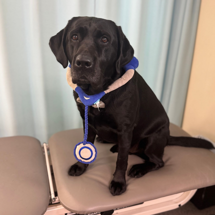 Say hello to Bear, our lovable English Black Lab and unofficial Chief Happiness Officer here at the Westchase Orthopaedics and Rehabilitation! Bear takes his job of spreading smiles very seriously — whether it’s greeting patients at the door, offering moral support during therapy sessions, or sneaking in for an occasional belly rub break.